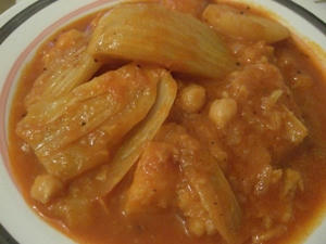 2)ジャガイモ、ビスベス(西洋セロリ)、ひよこ豆、ネギ科、塩コショウ、トマト缶、クミン、テーベル(チュニジア調味料)を投入してもっと炒める。