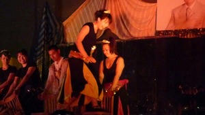 わたしはホストということで、目立つ役ももらえました!並んだ椅子の上に登って走って、マドンナポーズを決める振り付けがあったのだけれど、走ってる途中に椅子を壊してしまうというハプニングもあったりして(笑)。 共演者は笑いを堪えるの大変だし、ボスを見たら表情怖かったしで、これもまた思い出かしら。(下は、椅子を壊した直後の写真。恥ずかしそう…)