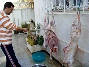 「アイードック・マブルーク」(犠牲祭おめでとう)と家族全員にビズ(ほっぺにチュー)&挨拶をして回ると、羊をしめるおじさん(お肉屋さん)登場。ボスファミリーは毎年3頭の羊をしめていて、今年も次々と羊がしめられていきます。美しい~。