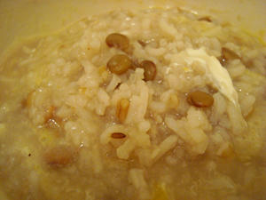 今朝は、レンズ豆と玄米とたまごたっぷりのおかゆさん。おーいしーっ。
