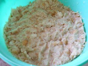 2)ぬるま水(1と2/3カップ)とビール(1カップ)を加え、もむようにしてよく混ぜ、全体にしっとりとしたら塩(大3)を入れ、まんべんなく混ぜる。