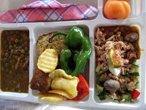 今日のメニュー(下写真)は、右から杏、サラダ2種(焼きサラダと、マリネサラダ)、ピーマン&トマト&ジャガイモを揚げたもの&羊肉の煮込み&タジン(野菜入り卵焼き)、グリーンピースのシチュウと、とっても豪華!お客さんが来る前に急いで戴いたけれど、とっても美味しゅうございました。